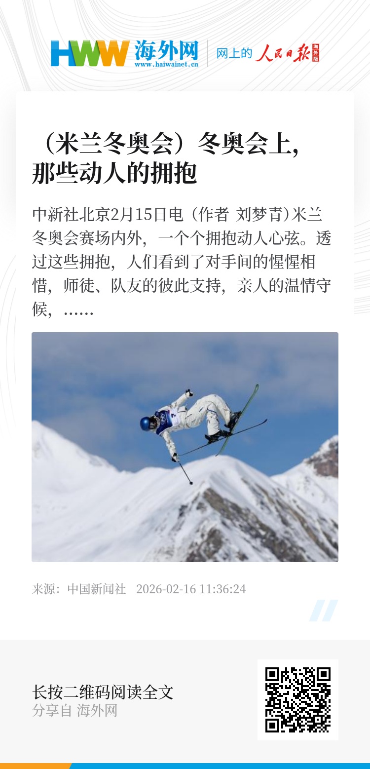 中新社北京2月15日电 (作者 刘梦青)米兰冬奥会赛场内外,一个个拥抱动人心弦。透过这些拥抱,人们看到了对手间的惺惺相惜,师徒、队友的彼此支持,亲人的温情守候,更看到了背后的坚持、梦想与热爱。