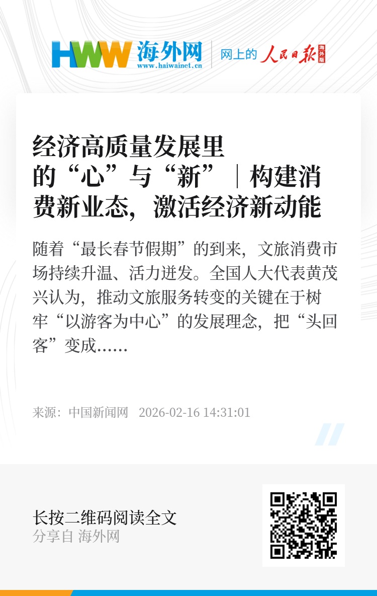 随着“最长春节假期”的到来,文旅消费市场持续升温、活力迸发。全国人大代表黄茂兴认为,推动文旅服务转变的关键在于树牢“以游客为中心”的发展理念,把“头回客”变成“回头客”、把“流量”变成“留量”。重庆发改委主任高健表示,重庆利用山城夜景、滨江岸线、后街支巷、楼宇天台、防空洞穴等特色优势,创新做靓“江崖街洞天”消费新场景。