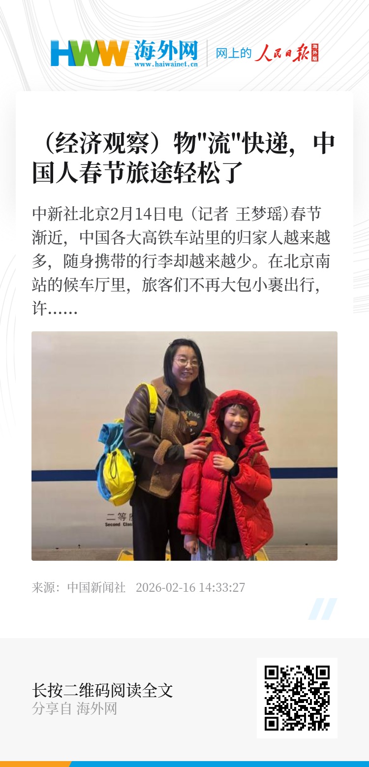 中新社北京2月14日电 (记者 王梦瑶)春节渐近,中国各大高铁车站里的归家人越来越多,随身携带的行李却越来越少。