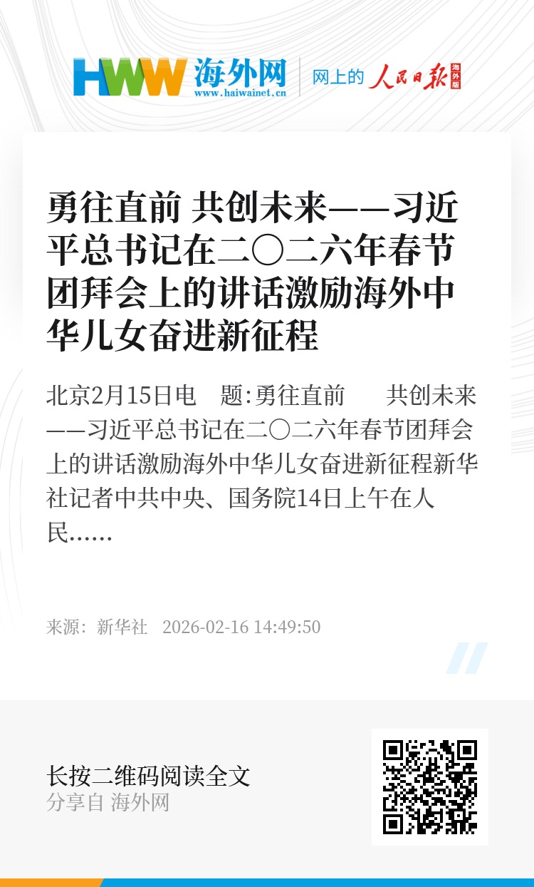 新华社北京2月15日电 题:勇往直前 共创未来——习近平总书记在二〇二六年春节团拜会上的讲话激励海外中华儿女奋进新征程