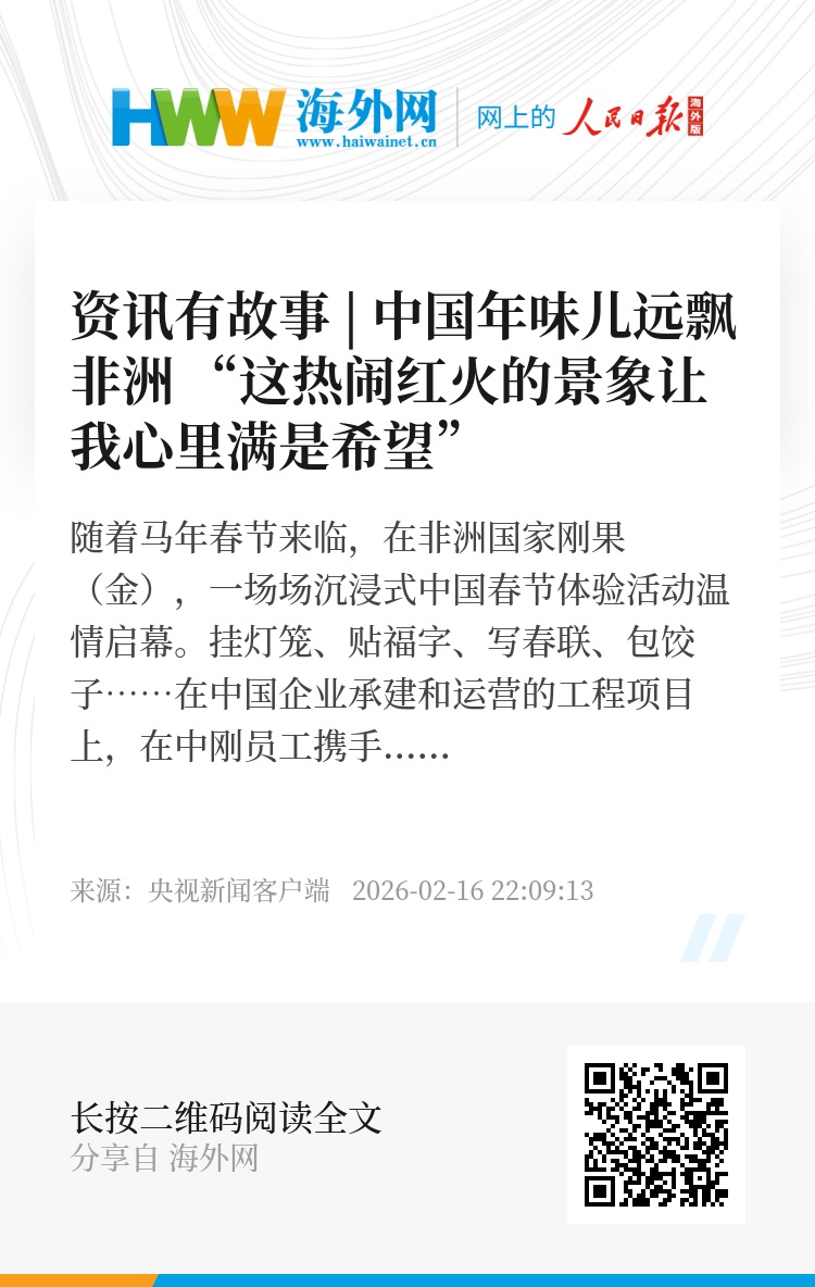 随着马年春节来临,在非洲国家刚果(金),一场场沉浸式中国春节体验活动温情启幕。挂灯笼、贴福字、写春联、包饺子……在中国企业承建和运营的工程项目上,在中刚员工携手体验中国年味的过程中,春节成为了连接两国民众友谊的“连心桥”。