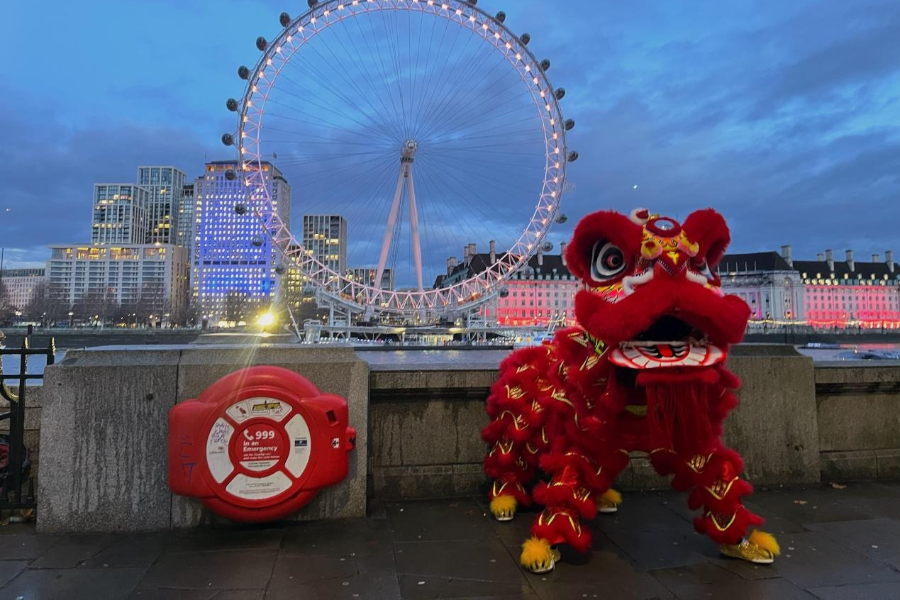 当地时间2月16日,正值中国农历除夕,英国地标建筑伦敦眼再度披上象征着喜庆与兴旺的红色和金色装扮,配合泰晤士河畔的舞狮表演,让伦敦洋溢着浓浓的中国年味。