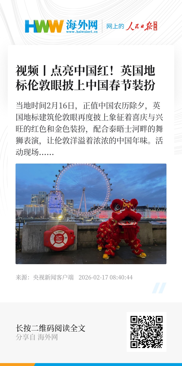 据了解,自2015年起,伦敦眼每逢农历新年都会点亮红色与金色灯光。这一传统不仅持续提升中国春节在海外的影响力,也为中英两国搭建起人文交流的桥梁。