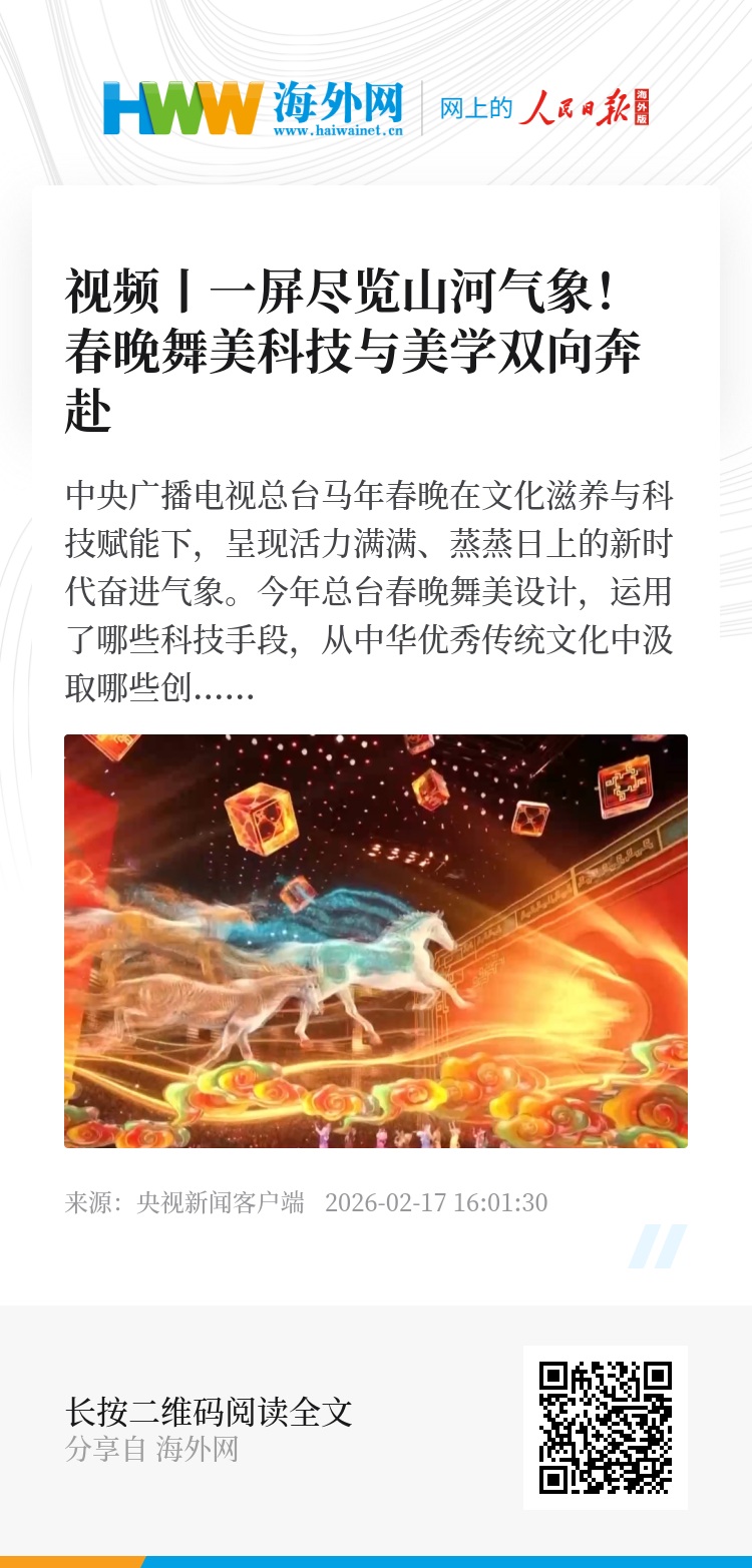 总台《2026年春节联欢晚会》视觉导演 国丽:从传统的绘画当中,我们提取马奔腾的这种生命力,从民间元素,比如说剪纸、雕塑、刺绣,提取吉祥、进取的寓意。利用马的动态美学,比如它的姿势、构图和线条,提炼出来马的这种精神。