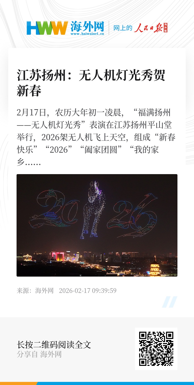 2月17日,农历大年初一凌晨,“福满扬州——无人机灯光秀”表演在江苏扬州平山堂举行,2026架无人机飞上天空,组成“新春快乐”“2026”“阖家团圆”“我的家乡是扬州”等字样和马、琼花等图案,为马年新春增添喜庆祥和的节日气氛。图源:视觉中国