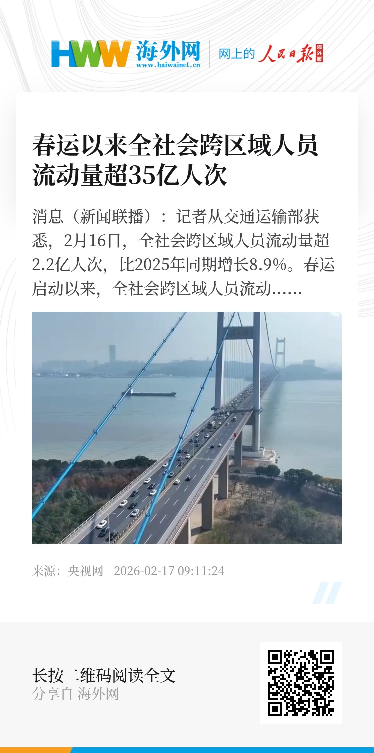 央视网消息(新闻联播):记者从交通运输部获悉,2月16日,全社会跨区域人员流动量超2.2亿人次,比2025年同期增长8.9%。春运启动以来,全社会跨区域人员流动量累计超35亿人次。