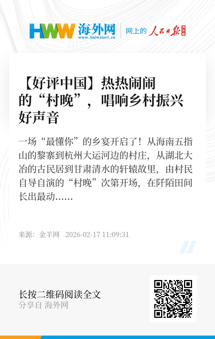“村晚”承载着乡亲们满心期待,属于村民自己的文化盛宴,照亮活力满满、热气腾腾的乡村图景,是新春最动人的仪式。从区域的“小欢喜”到遍及全国的“大联欢”,从单一文艺演出到促进文旅融合,从丰富精神食粮到赋能乡村治理,“村晚”遍地开花、精彩纷呈,诠释了人们对美好幸福的追求,凝聚着砥砺前行的奋进力量。(金羊网 文/范子军)