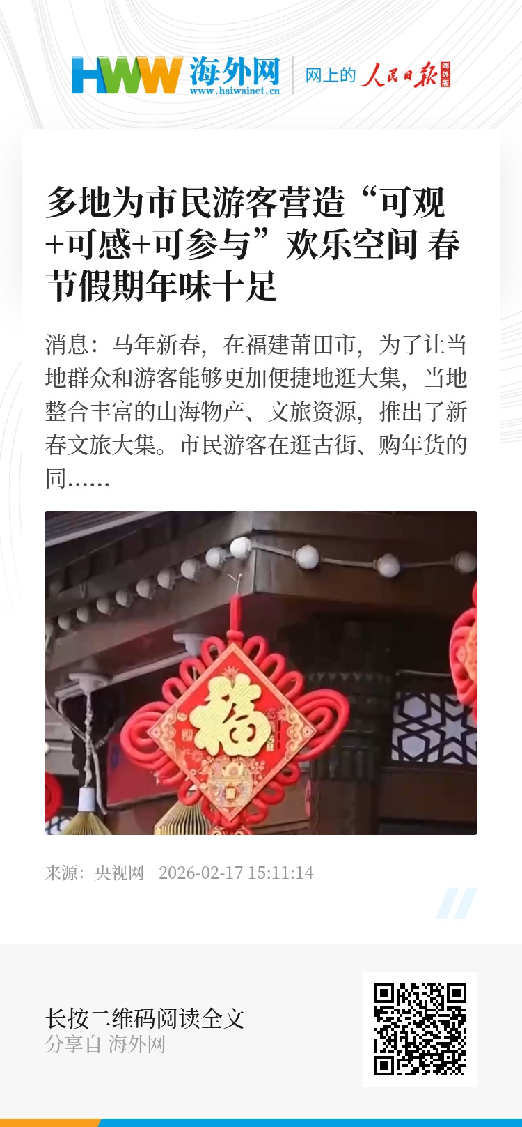 央视网消息:马年新春,在福建莆田市,为了让当地群众和游客能够更加便捷地逛大集,当地整合丰富的山海物产、文旅资源,推出了新春文旅大集。市民游客在逛古街、购年货的同时,还能欣赏民俗表演。