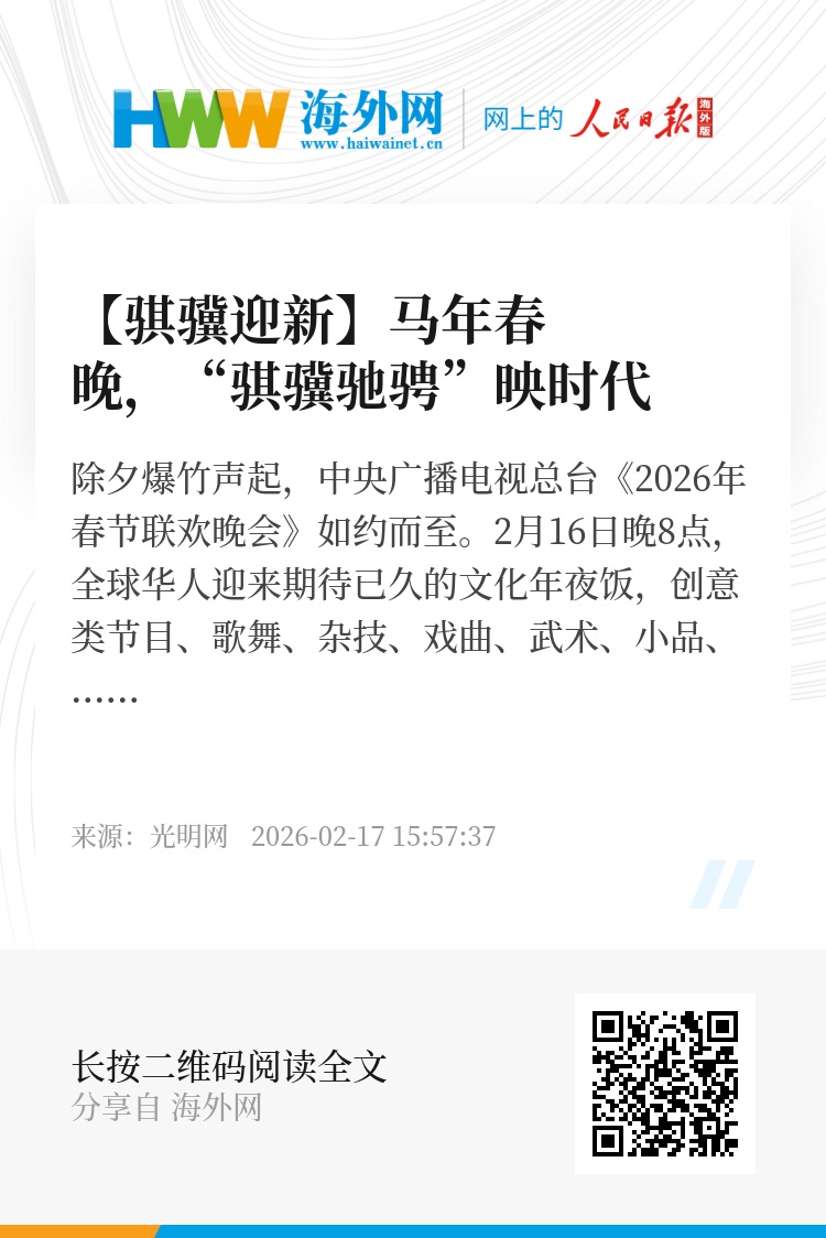 除夕爆竹声起,中央广播电视总台《2026年春节联欢晚会》如约而至。2月16日晚8点,全球华人迎来期待已久的文化年夜饭,创意类节目、歌舞、杂技、戏曲、武术、小品、魔术等集中亮相,吉祥喜庆的气氛分外浓厚。自1983年起,春晚扎根春节民俗,成为国人辞旧迎新的情感纽带。时值乙巳丙午之交,总台春晚以生肖马的文化内涵为脉络,从传统文化创新表达到中外艺术跨界融合,让奔腾的马成为窥见时代风貌的文化符号,勾勒出中华儿女踔厉奋发的精神图景。