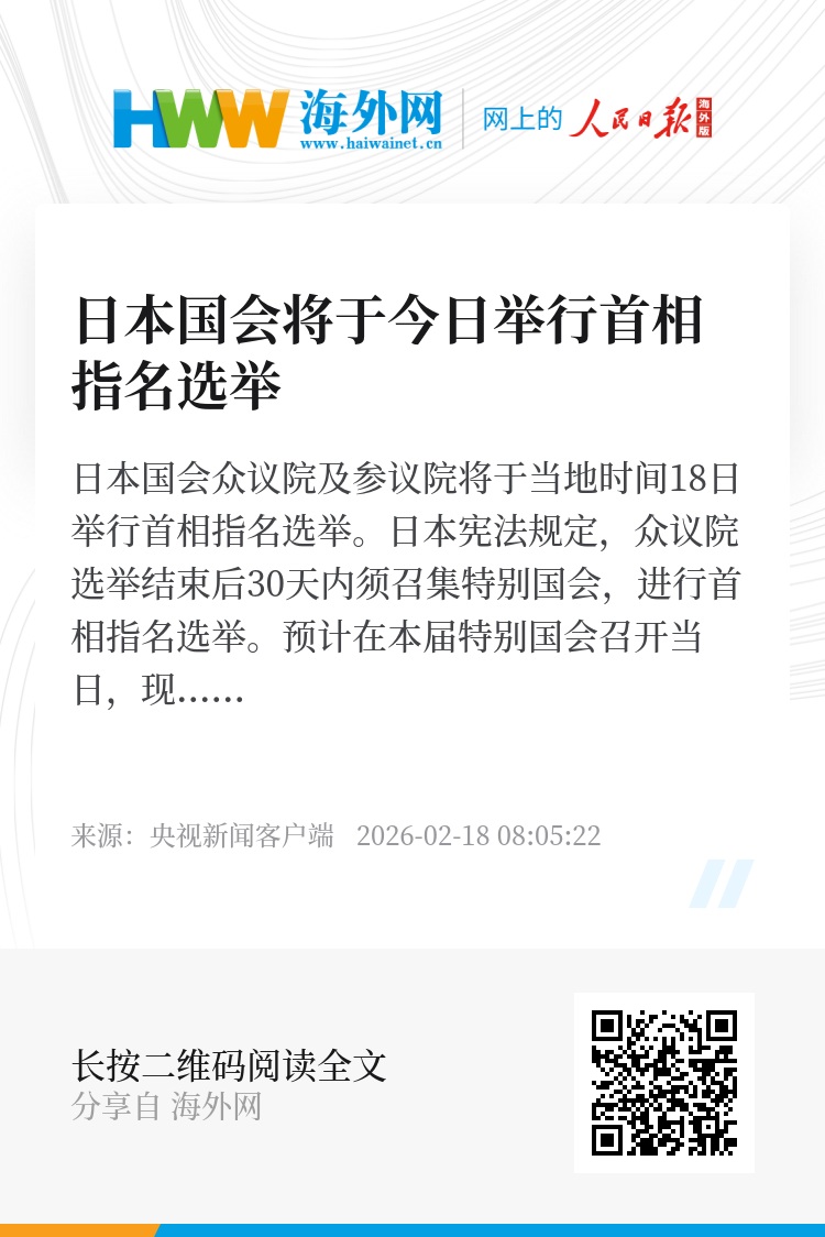日本国会众议院及参议院将于当地时间18日举行首相指名选举。日本宪法规定,众议院选举结束后30天内须召集特别国会,进行首相指名选举。预计在本届特别国会召开当日,现任高市内阁将集体辞职,由新当选议员组成的众议院与现有参议院阵容分别进行投票,选出新一任首相,并据此重新组阁。