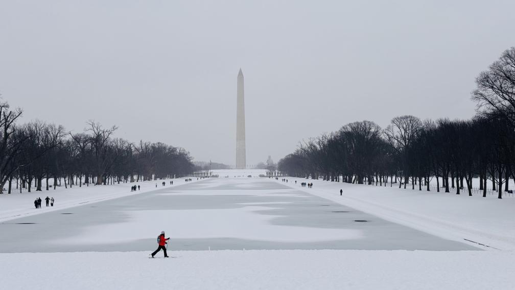 1月25日,人们在美国首都华盛顿林肯纪念堂倒影池旁的雪中行走。新华社记者徐剑梅摄