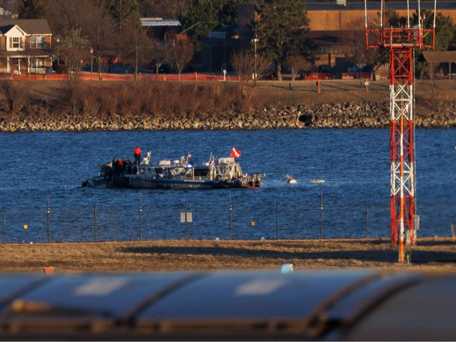 2025年2月1日,工作人员在美国华盛顿里根国家机场旁的波托马克河上打捞飞机残骸。新华社发(亚伦摄)