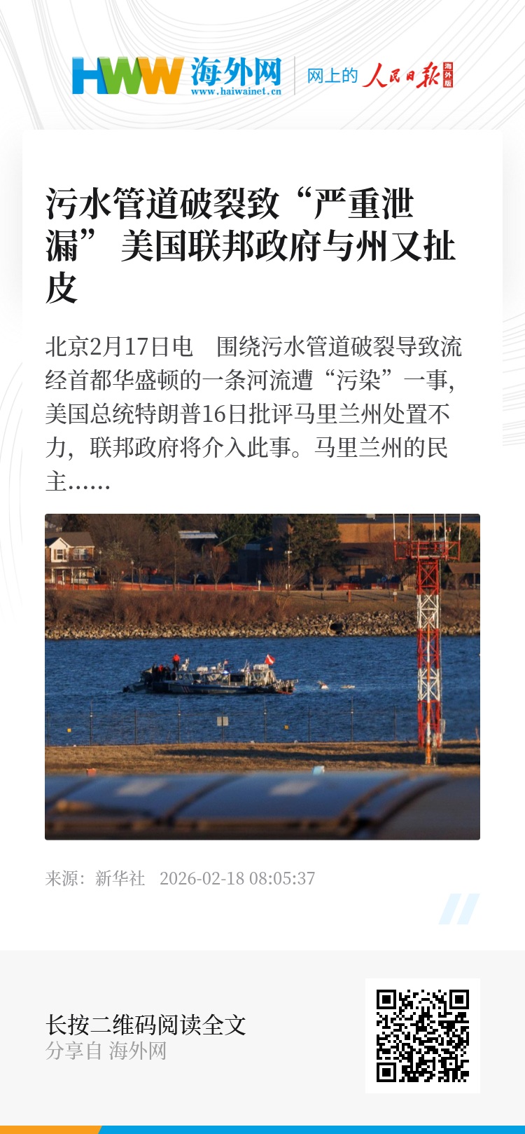 新华社北京2月17日电 围绕污水管道破裂导致流经首都华盛顿的一条河流遭“污染”一事,美国总统特朗普16日批评马里兰州处置不力,联邦政府将介入此事。马里兰州的民主党籍州长韦斯·穆尔方面则回击称,管道归联邦机构管理,特朗普领导的共和党政府才应对此事负责。