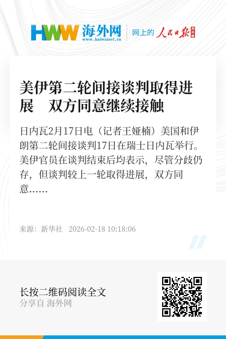新华社日内瓦2月17日电(记者王娅楠)美国和伊朗第二轮间接谈判17日在瑞士日内瓦举行。美伊官员在谈判结束后均表示,尽管分歧仍存,但谈判较上一轮取得进展,双方同意继续接触。