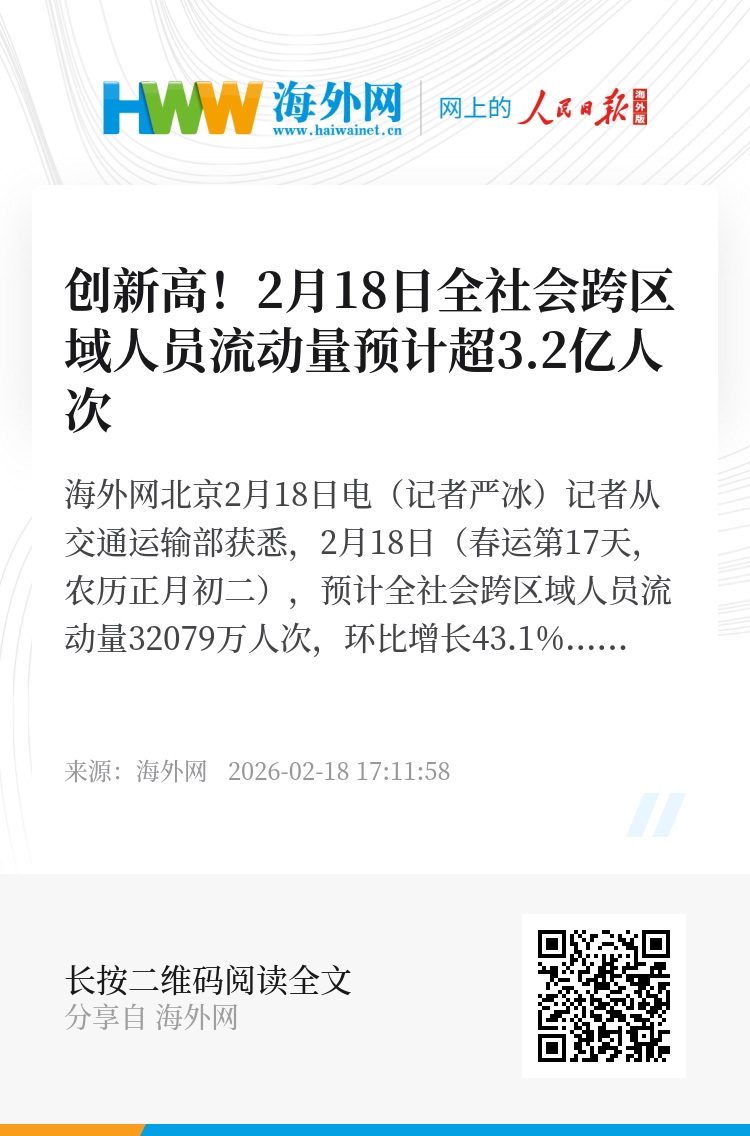 海外网北京2月18日电(记者严冰)记者从交通运输部获悉,2月18日(春运第17天,农历正月初二),预计全社会跨区域人员流动量32079万人次,环比增长43.1%,比2025年同期增长9%。其中: