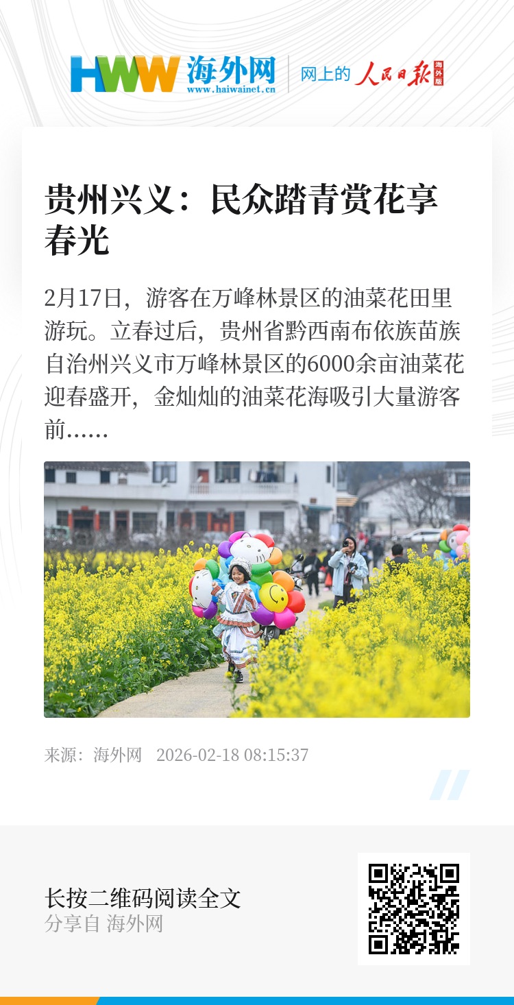 2月17日,游客在万峰林景区的油菜花田里游玩。立春过后,贵州省黔西南布依族苗族自治州兴义市万峰林景区的6000余亩油菜花迎春盛开,金灿灿的油菜花海吸引大量游客前来赏花,享受美好春光。图源:视觉中国