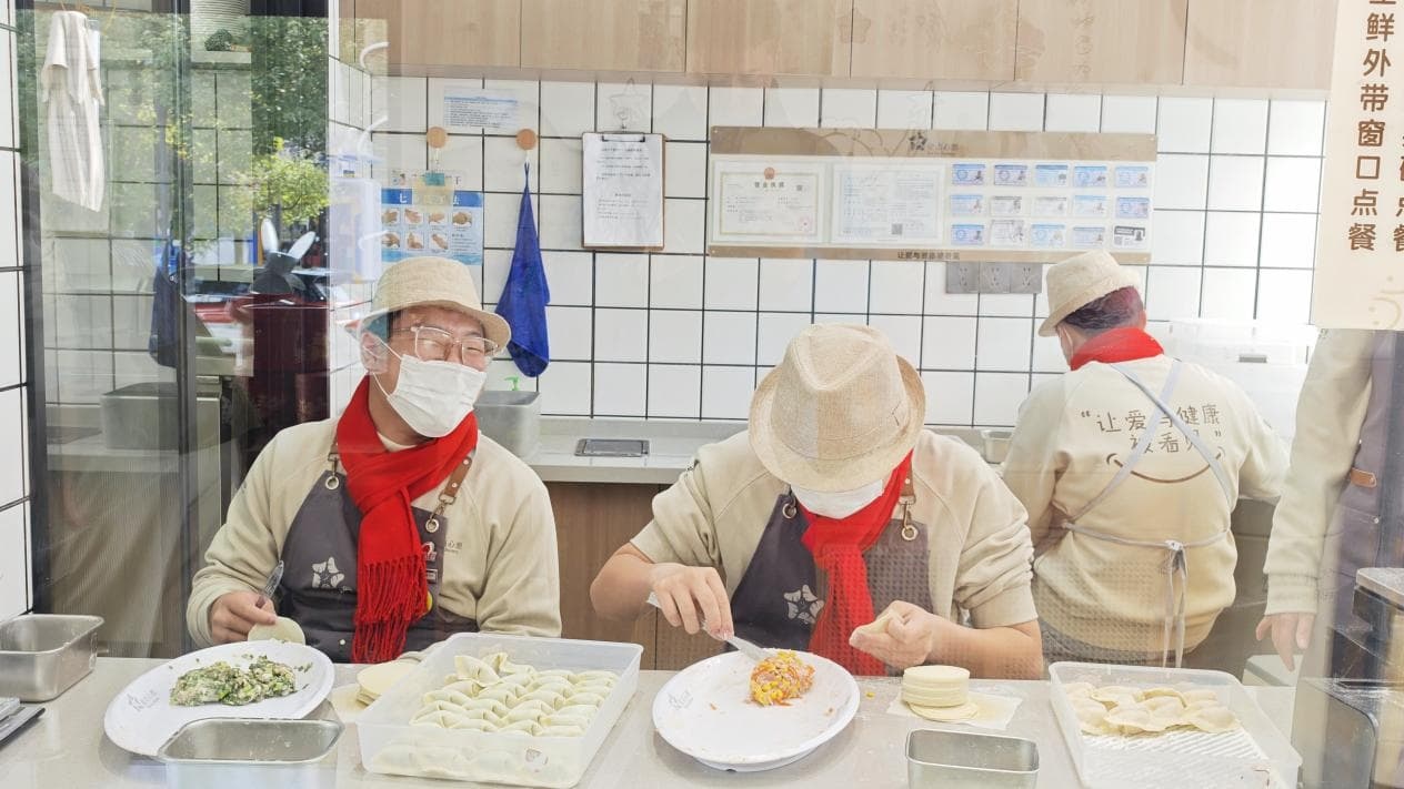 10点刚过,到店的客流量明显增加,星青年们在各自岗位上忙碌起来。店内后厨,擀皮、撇馅儿,嘉禾和杰希熟练地包着饺子,不一会儿就填满了一整盒,大小、形状几乎完全相同。