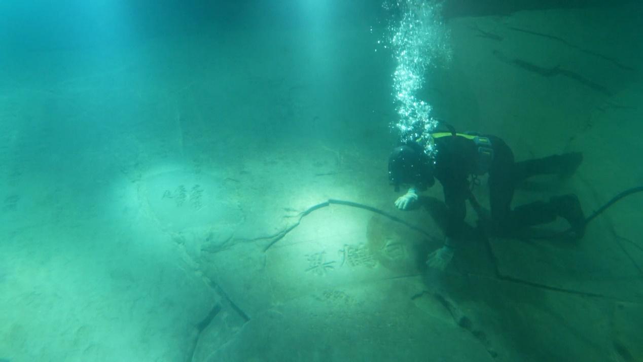 潜水员 赵春霞:每次潜水下去,就会有种穿越时空的感觉。你去清洗的时候,摸到石刻,你能够感受到古人的一笔一画,就好像古人在教我写字。每一次把它清理得更好,然后让它以最好、最完美的一种状态去展示给我们的游客。我自己是特别热爱这个事业的。