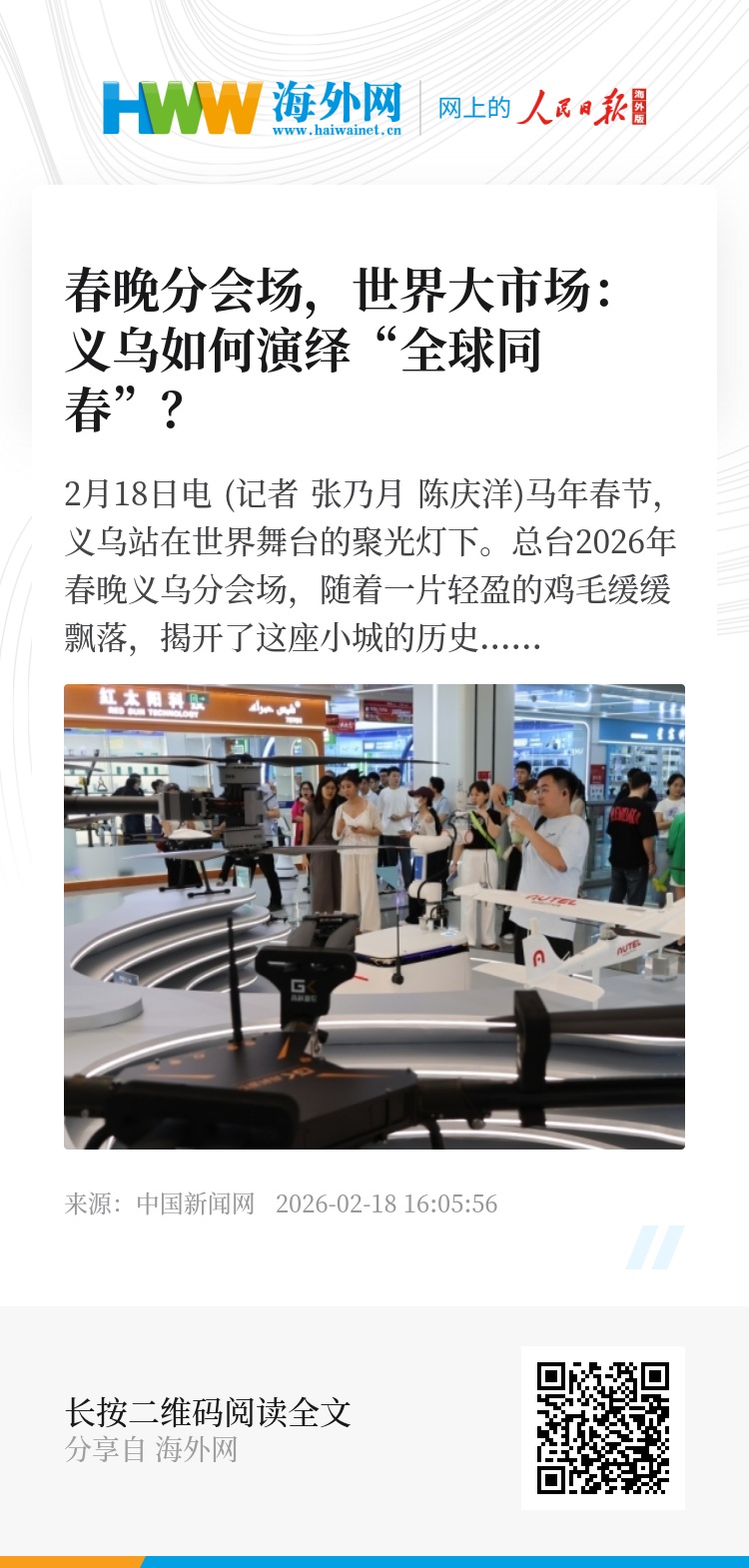 中新网2月18日电 (记者 张乃月 陈庆洋)马年春节,义乌站在世界舞台的聚光灯下。