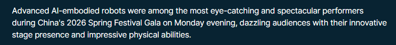 文章强调,人工智能软件、机器人硬件以及制造业规模的融合使中国具备了在下一代自动化领域制定标准的能力。春晚传递出一个信号:中国人形机器人正从表演舞台走向实际应用领域,而中国也意在引领这一转变。