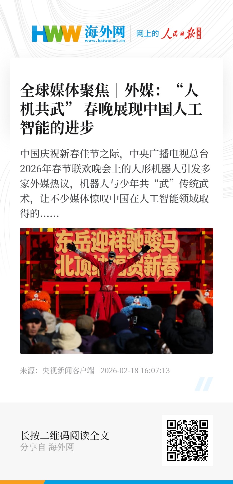 欧洲《现代外交》网站17日刊文指出,中国通过春晚展示了人形机器人技术,是国家技术进步和产业战略的象征。文章称,今年春晚的节目重点突出了中国在人形机器人技术、人工智能和下一代制造业领域发展的雄心。有四家机器人公司展示了能够完成武术动作、同步舞蹈以及与演员进行互动表演的人形机器人。