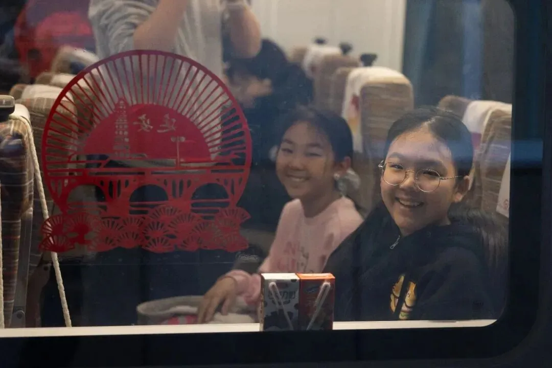 2月2日,在G6701次列车上,小朋友在发车前开心地对镜头微笑。张武军 摄