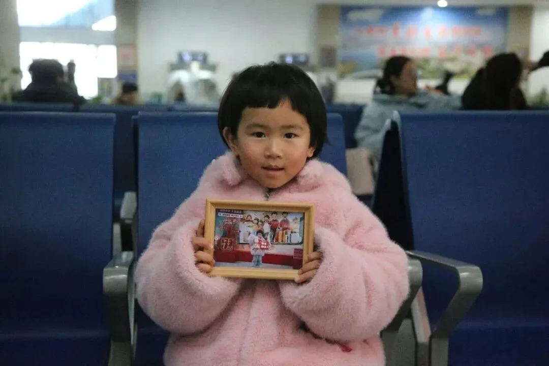 2月2日,阜阳站候车大厅内,一名跟随母亲返乡的小女孩向摄影师展示志愿者为她拍的照片。当天,阜阳颍东青年志愿者协会、阜阳北站团委联合开展了“情暖旅途 定格最美瞬间”公益拍照活动。韩振 摄