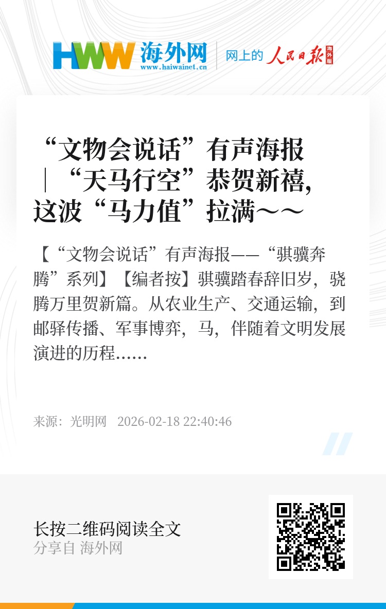 【编者按】骐骥踏春辞旧岁,骁腾万里贺新篇。从农业生产、交通运输,到邮驿传播、军事博弈,马,伴随着文明发展演进的历程而奔腾,驮载着人们对美好生活的向往,体现着中华民族开拓进取、驰而不息的品格。本期“文物会说话”有声海报专栏,甄选多件以“马”为形象的文物,以第一人称视角,通过有声海报与AI配音等形式,一同汲取这份跃马扬鞭、一往无前的精神力量,共赴一场“马”力全开的新春之约!