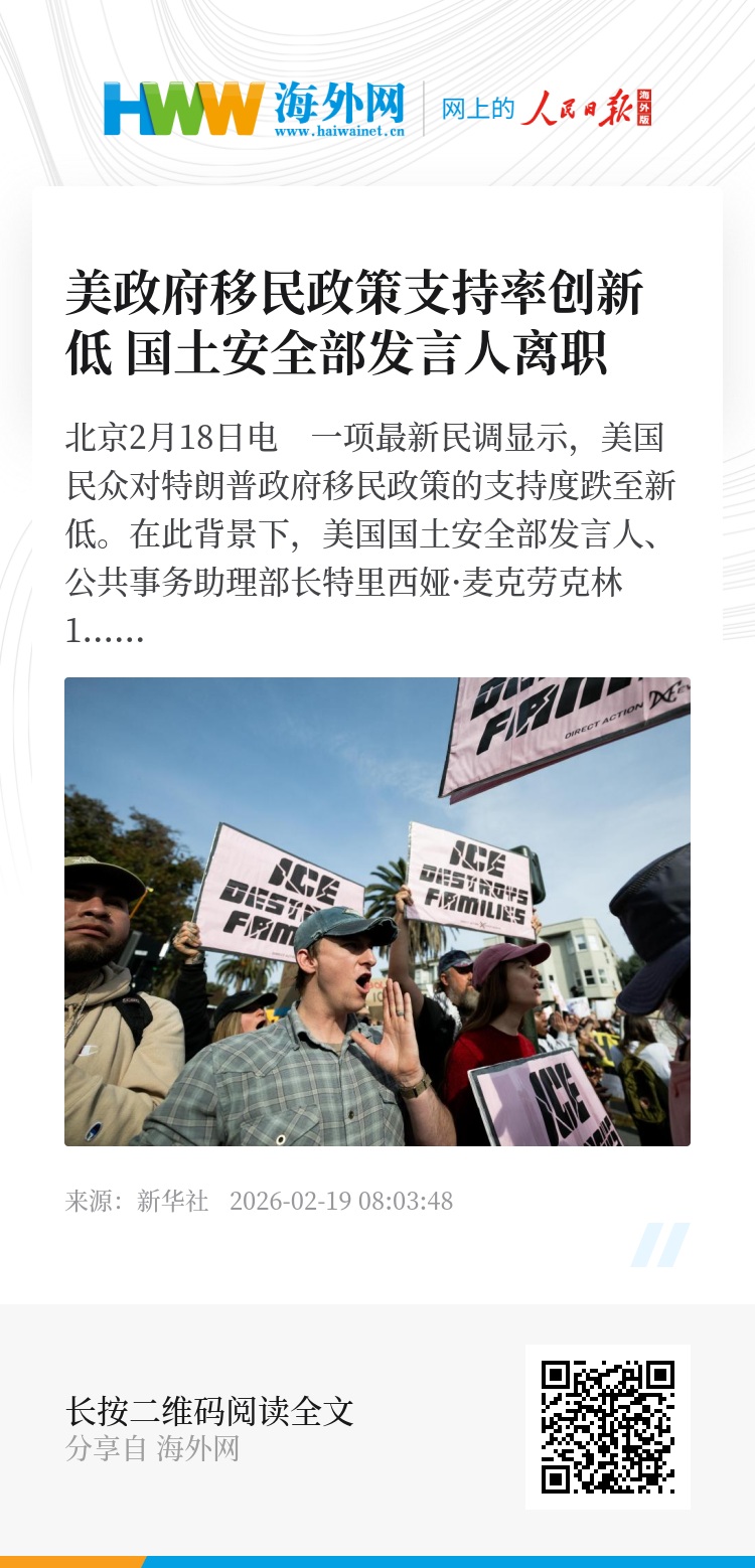 新华社北京2月18日电 一项最新民调显示,美国民众对特朗普政府移民政策的支持度跌至新低。在此背景下,美国国土安全部发言人、公共事务助理部长特里西娅·麦克劳克林17日宣布将离职。