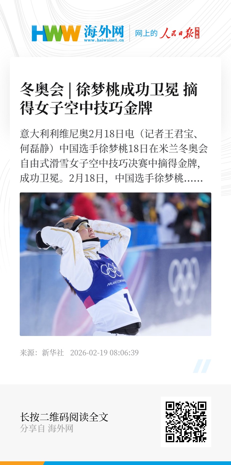 新华社意大利利维尼奥2月18日电(记者王君宝、何磊静)中国选手徐梦桃18日在米兰冬奥会自由式滑雪女子空中技巧决赛中摘得金牌,成功卫冕。