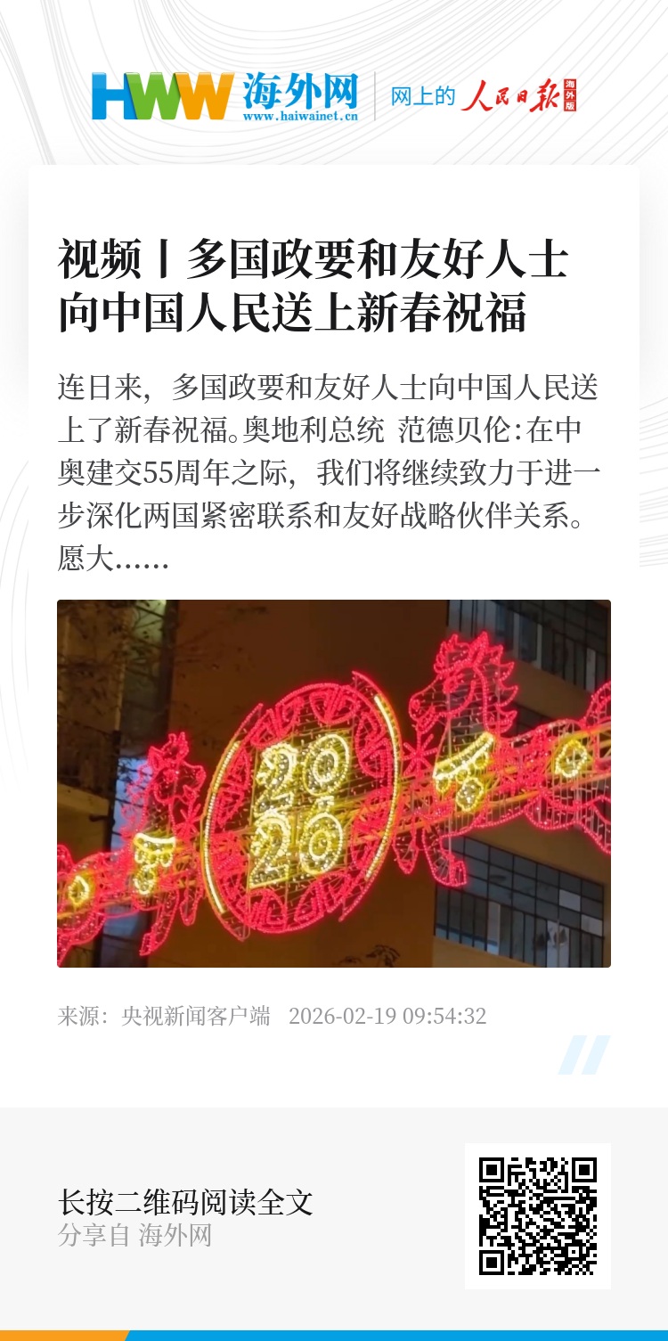 奥地利总统 范德贝伦:在中奥建交55周年之际,我们将继续致力于进一步深化两国紧密联系和友好战略伙伴关系。愿大家“火马年”健康、幸福和自由。