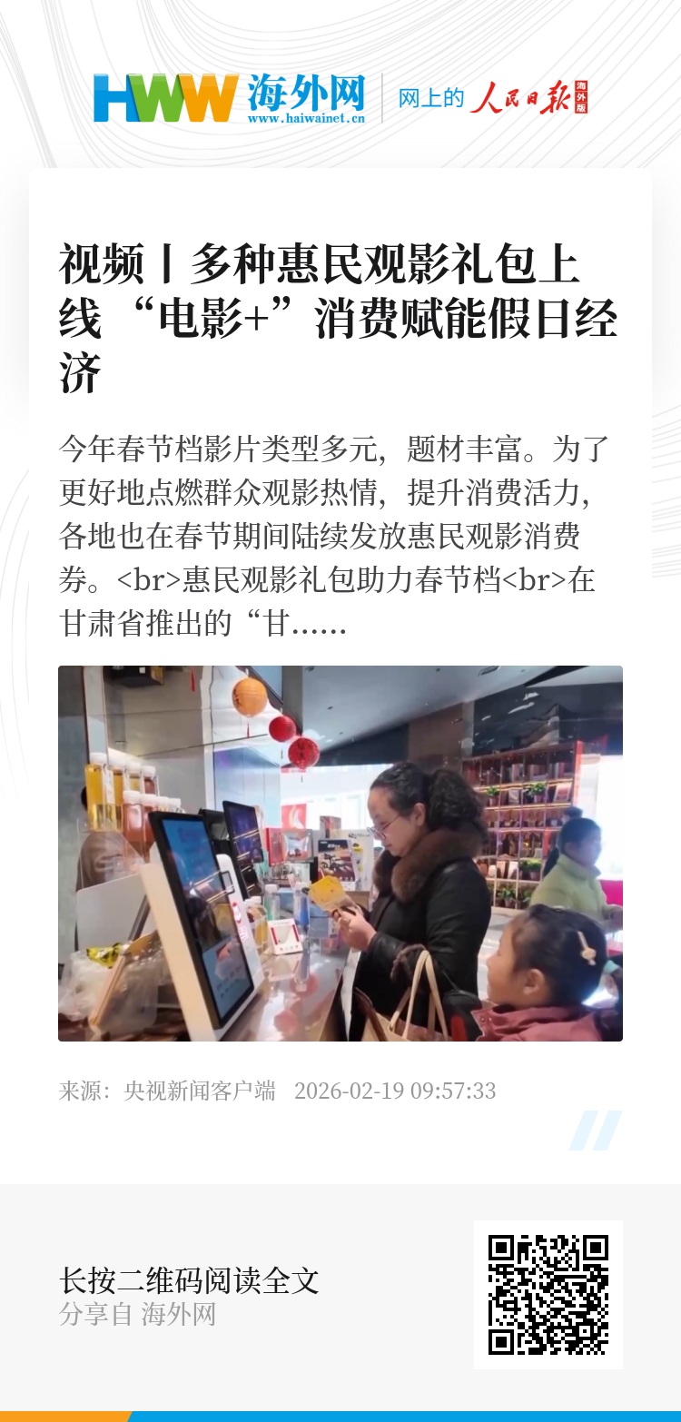 在甘肃省推出的“甘肃省2026年惠民观影促消费之‘春节档’活动”,将联合多方资源,推出“惠民观影”大礼包,助力春节档电影市场持续升温。