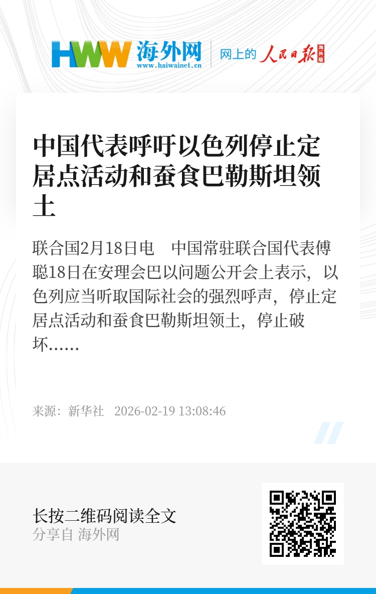 傅聪说,近日以色列宣布多项决定,在约旦河西岸开展土地登记,扩张对西岸的行政和执法措施。有关决定违反《奥斯陆协议》、国际法和安理会决议,将扩大对巴勒斯坦的非法占领,破坏“两国方案”政治基础,并刺激约旦河西岸和加沙脆弱局势。中方坚定支持巴勒斯坦人民恢复民族合法权利的正义事业,将继续同国际社会共同努力,推动加沙全面持久停火,缓解人道危机,落实“两国方案”,早日实现巴勒斯坦问题全面、公正、持久解决。