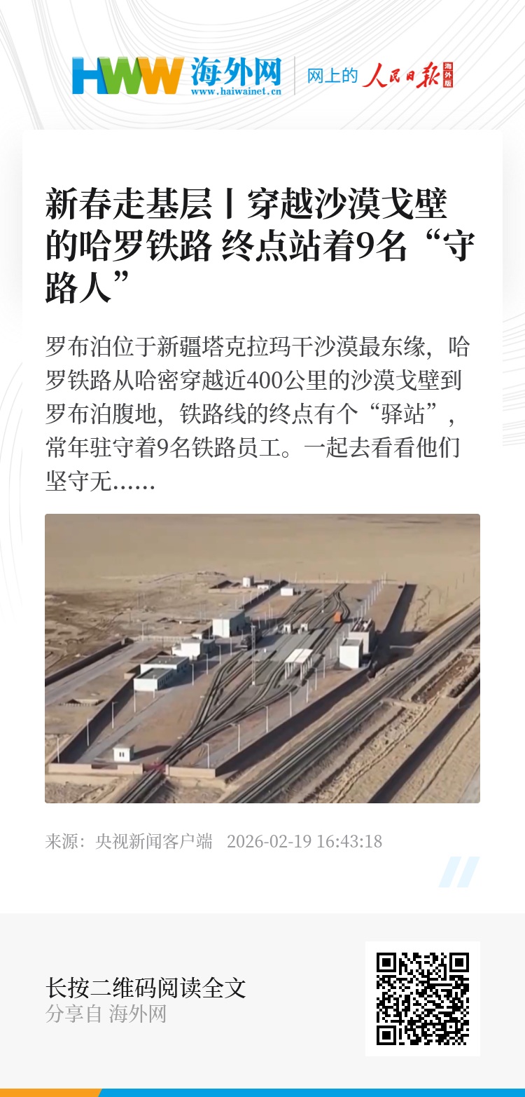 国铁乌鲁木齐局哈密机务段罗中折返车间检修工 李明强:爸、妈,儿子在这给您拜年了。今年除夕我可能回不去了,但是你放心。大漠戈壁也是另一种风景,罗布泊有平时看不见的星空,落日也非常漂亮。在这里走好自己的每一步,就是对我们西部更好的一个发展。我觉得我的青春能在这里绽放出更加绚丽的色彩。