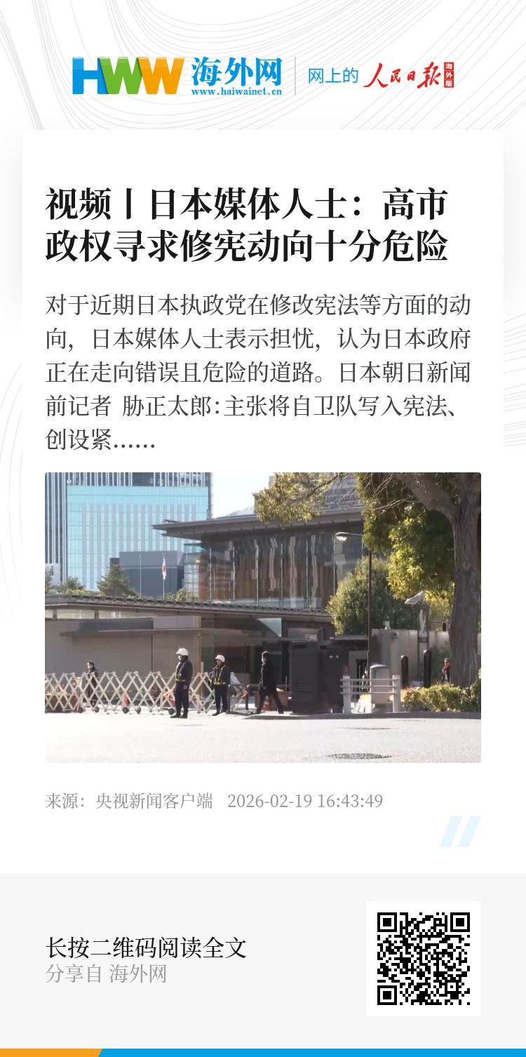 日本朝日新闻前记者 胁正太郎:主张将自卫队写入宪法、创设紧急事态条款,自民党提出所谓“修宪四项”里主要就是这两项议题。执政联盟中加入了日本维新会更加危险,日本宪法第9条第(二)项是放弃战争的内容,想要消除掉这一项,无论是哪种都是非常危险的。高市会让日本变为发动战争的国家。