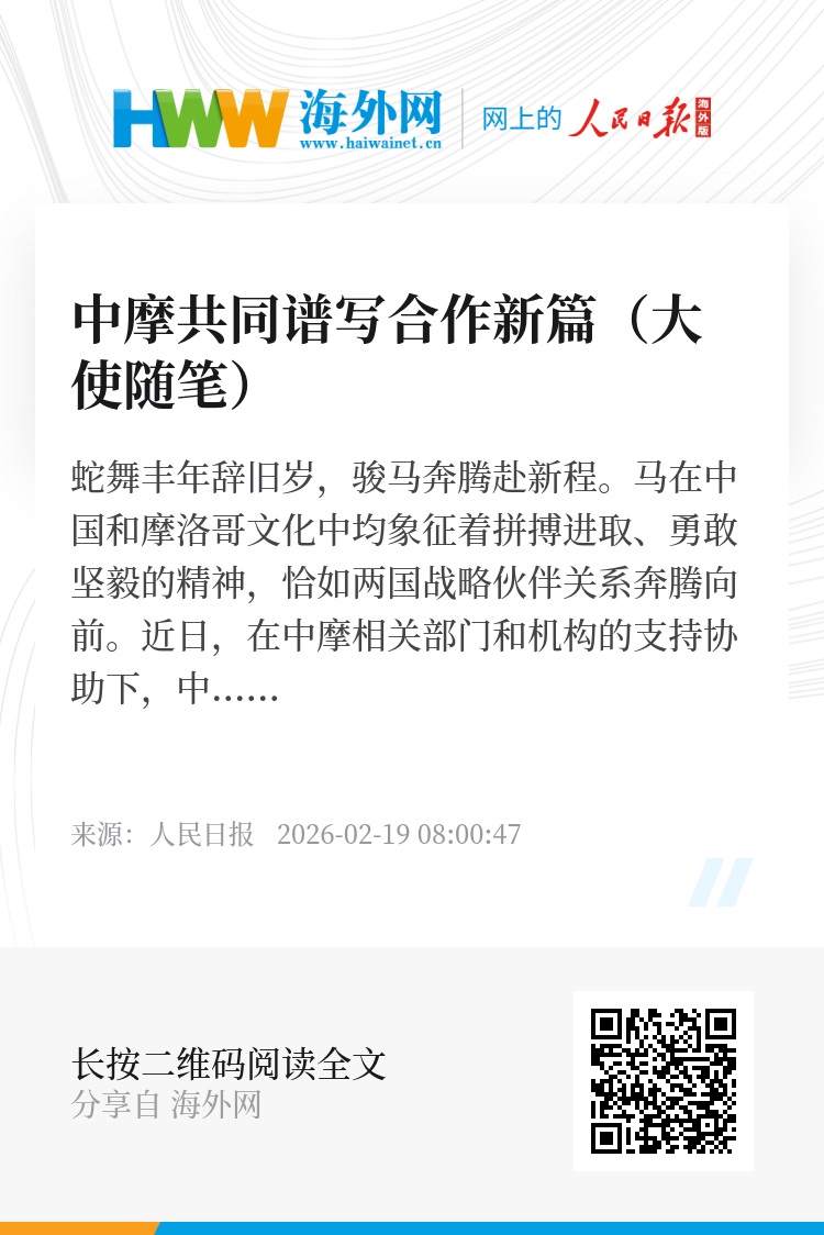 在两国元首战略指引下,中摩关系展现出蓬勃生机与巨大潜力。2026年是“十五五”开局之年,中方愿同摩方进一步加强两国战略对接,在更高水平、更广领域共同谱写新的辉煌篇章,增进中阿、中非友好,为推动构建人类命运共同体作出新的更大贡献。