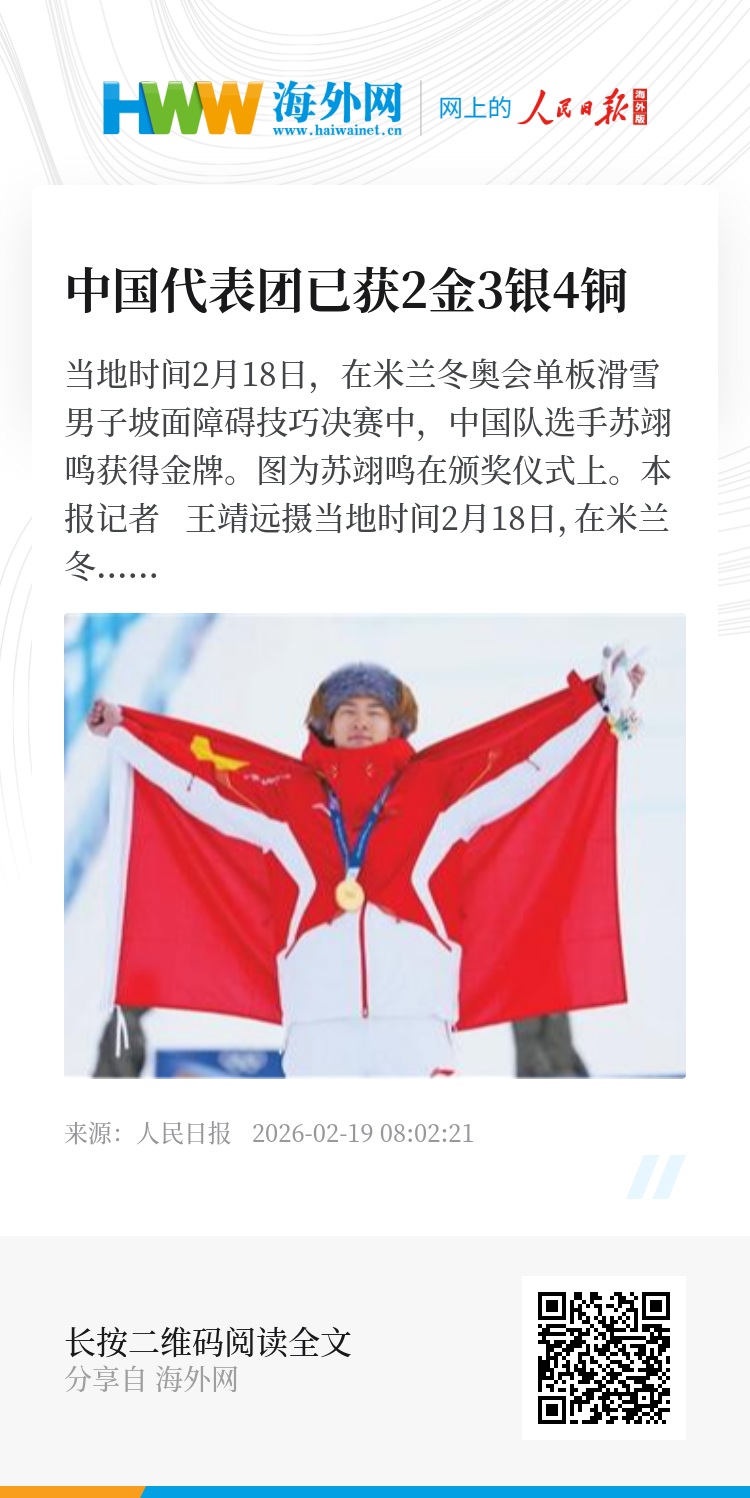 人民日报意大利利维尼奥2月18日电(记者陈晨曦、曾华锋)当地时间2月18日,米兰冬奥会进入第十二个比赛日,苏翊鸣在单板滑雪男子坡面障碍技巧决赛中摘得金牌,徐梦桃在自由式滑雪女子空中技巧项目上蝉联冠军。截至目前,中国体育代表团已经在米兰冬奥会上获得2金3银4铜。