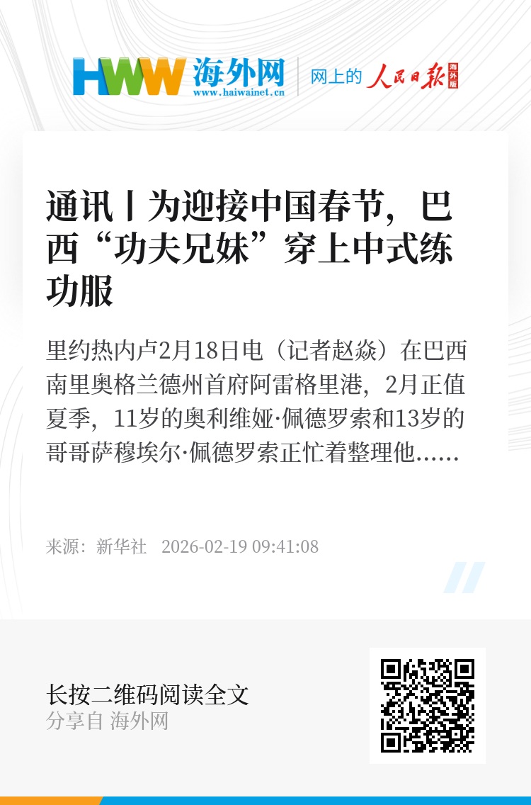 新华社里约热内卢2月18日电(记者赵焱)在巴西南里奥格兰德州首府阿雷格里港,2月正值夏季,11岁的奥利维娅·佩德罗索和13岁的哥哥萨穆埃尔·佩德罗索正忙着整理他们的“战袍”。这对兄妹穿上中式练功服,迎接他们心中最重要的节日之一——中国春节。