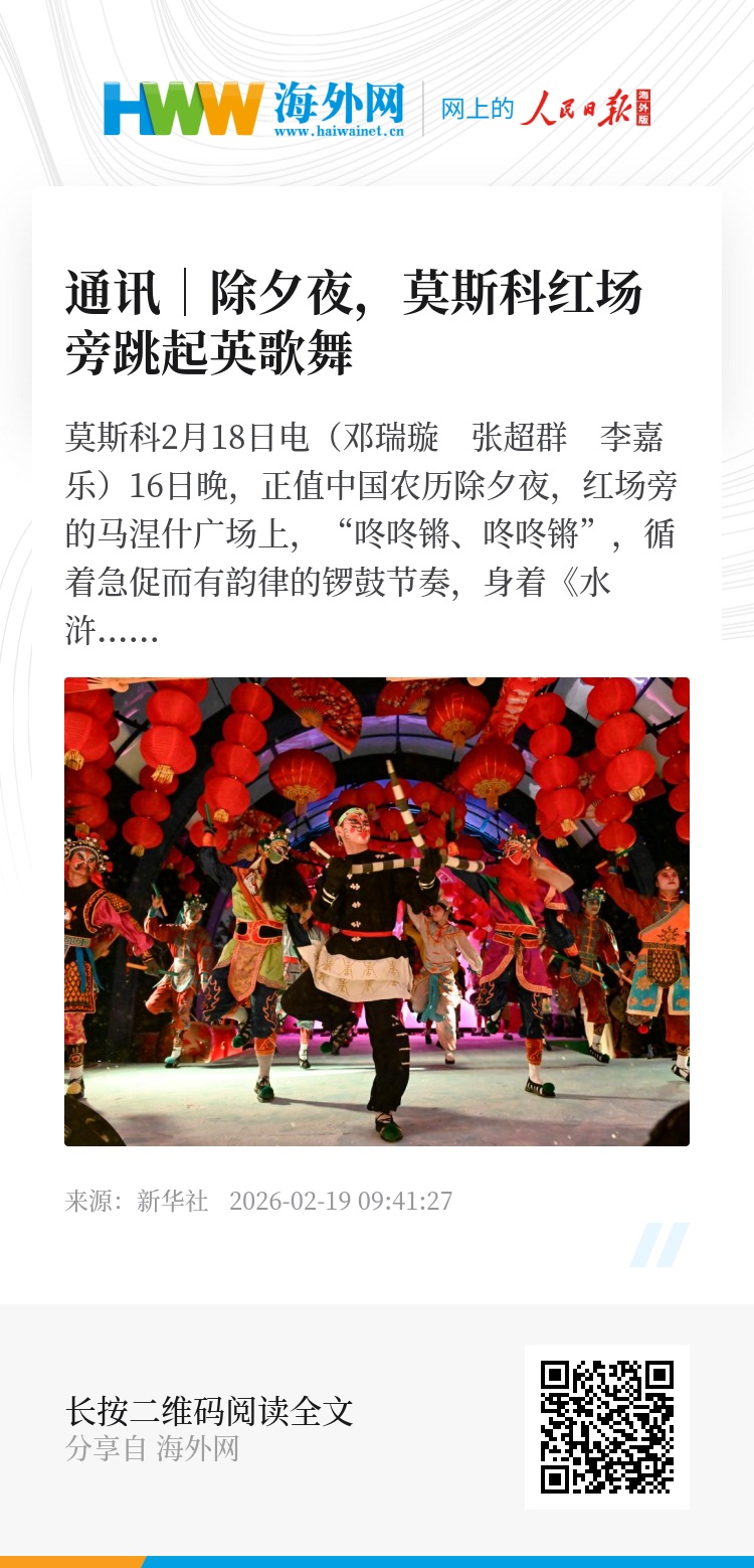 新华社莫斯科2月18日电(邓瑞璇 张超群 李嘉乐)16日晚,正值中国农历除夕夜,红场旁的马涅什广场上,“咚咚锵、咚咚锵”,循着急促而有韵律的锣鼓节奏,身着《水浒传》英雄人物服装的表演者迈出欢腾的步伐,燃起火热的新春氛围。