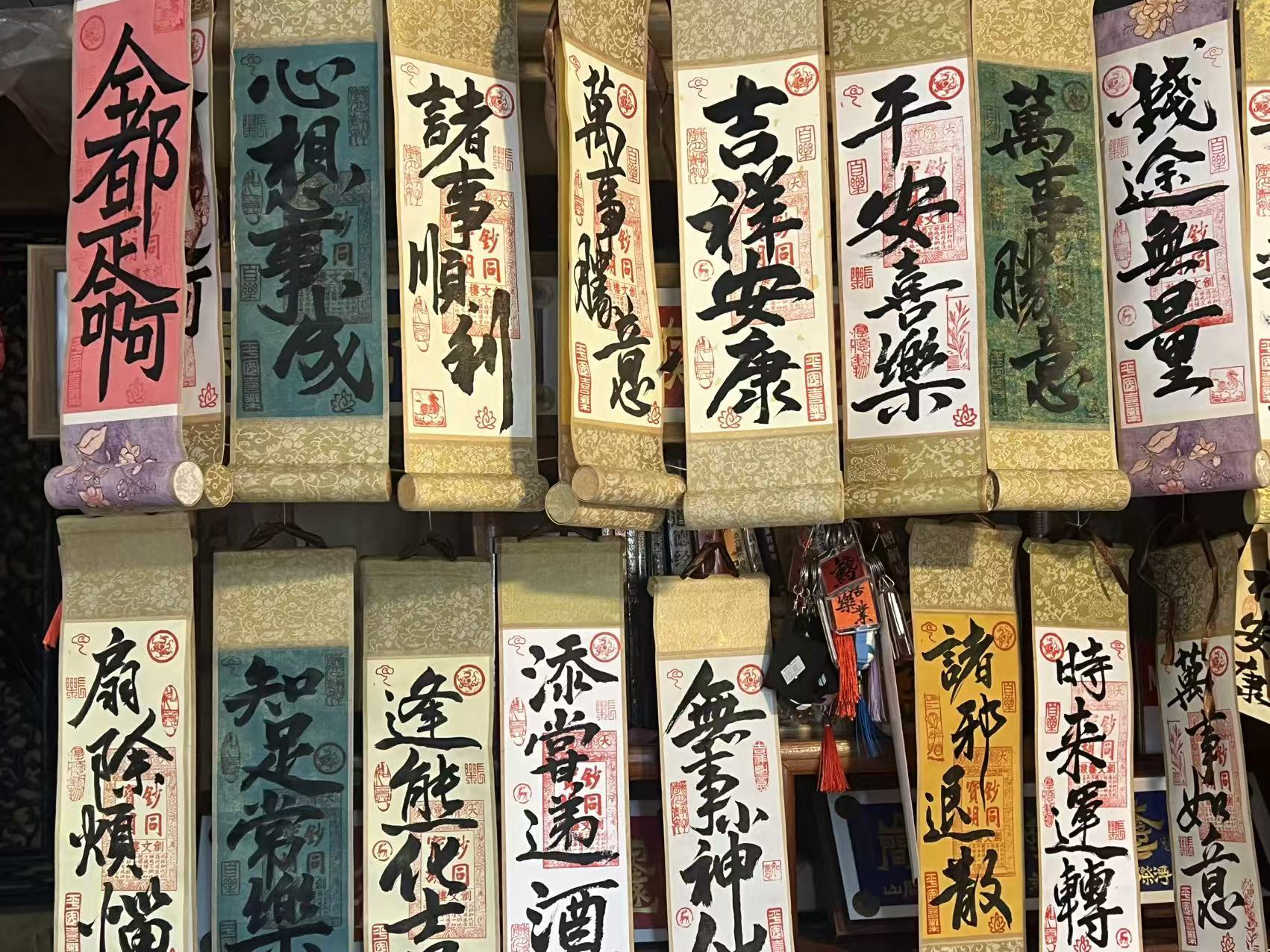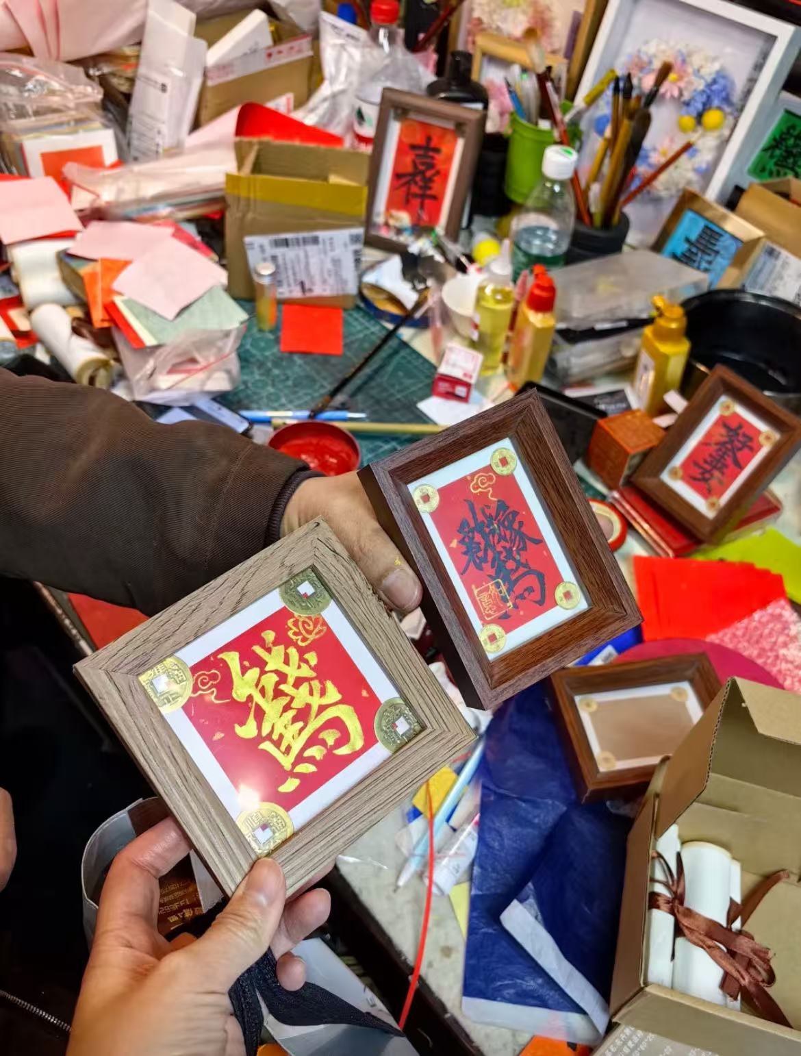 十平方左右的小店里,墙上、桌上,毛笔、自制卷轴、摆台,满满当当。店主王建宇正伏在案头,手握毛笔,笔尖蘸饱了墨汁,在洒金红纸上落下最后一笔。