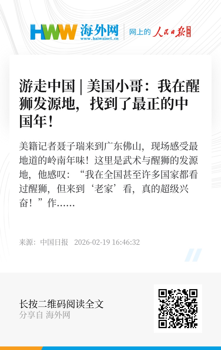 美籍记者聂子瑞来到广东佛山,现场感受最地道的岭南年味!这里是武术与醒狮的发源地,他感叹:“我在全国甚至许多国家都看过醒狮,但来到‘老家’看,真的超级兴奋!”作为春节的“气氛担当”,醒狮是吉祥如意的象征,高桩“采青”更是勇气与默契的完美展现,正如岭南人敢为人先的精神!在广州、香港、澳门,喜庆日子必有醒狮助兴,它是湾区共同的文化象征,也是春节最燃的仪式感——“每一次跳跃、转身,都充满力量,Absolutely amazing!”这个春节,一起接住这份满满能量吧!(中国日报文化频道出品)