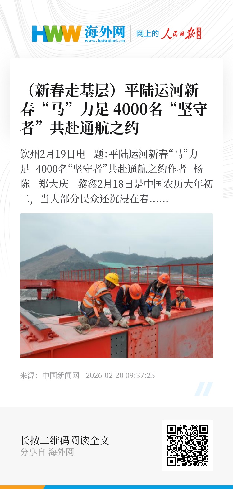 中新网钦州2月19日电 题:平陆运河新春“马”力足 4000名“坚守者”共赴通航之约