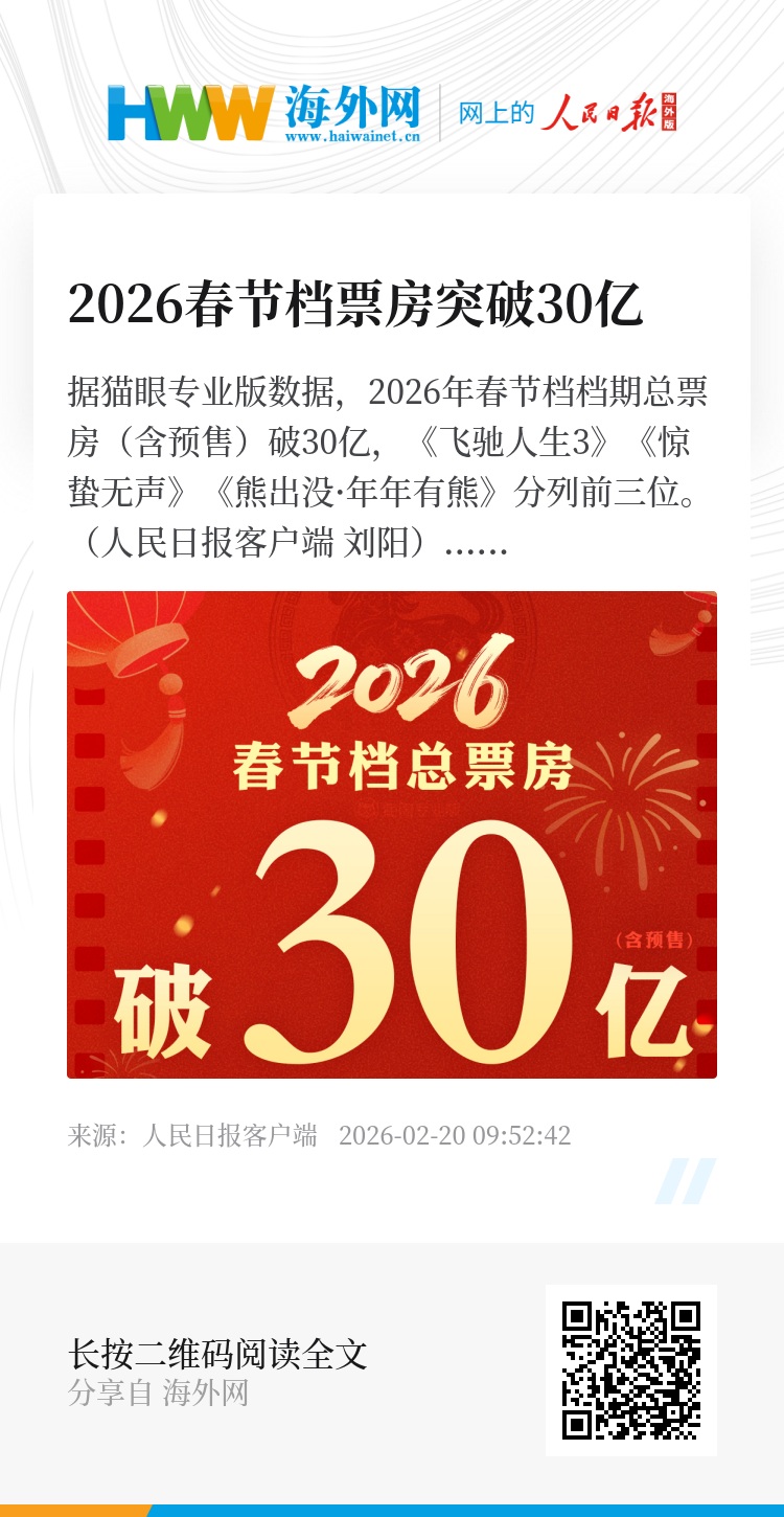 据猫眼专业版数据,2026年春节档档期总票房(含预售)破30亿,《飞驰人生3》《惊蛰无声》《熊出没·年年有熊》分列前三位。