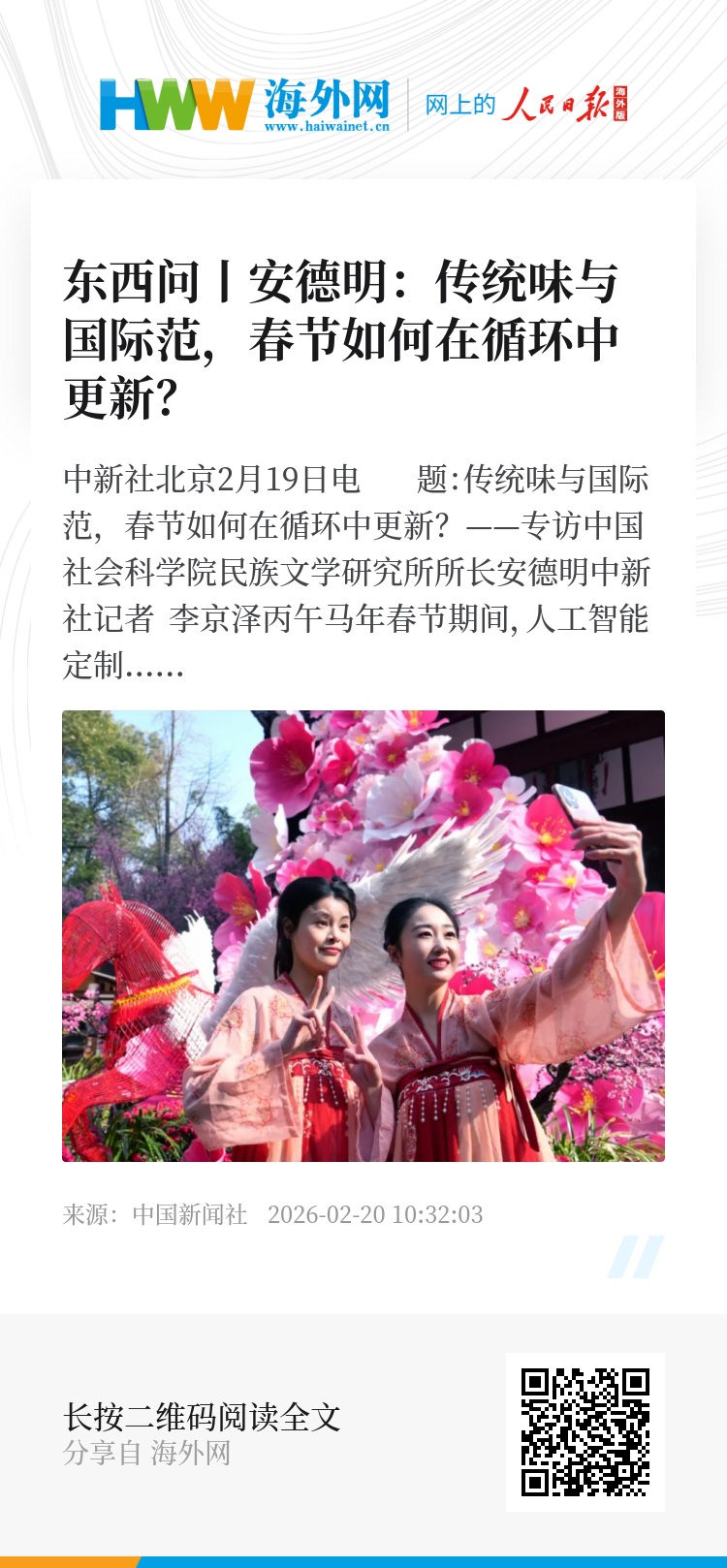 应该如何理解这些“变”与“不变”?当春节越发彰显国际范,又该如何在传统与创新的融合中读懂其独特魅力?中国社会科学院民族文学研究所所长安德明近日接受中新社“东西问”专访,以“循环中更新”为视角,解答上述问题。