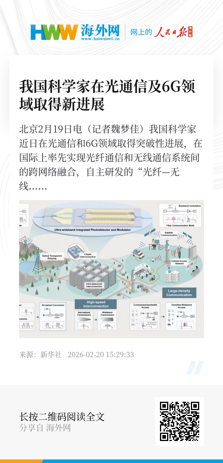 新华社北京2月19日电(记者魏梦佳)我国科学家近日在光通信和6G领域取得突破性进展,在国际上率先实现光纤通信和无线通信系统间的跨网络融合,自主研发的“光纤—无线一体化融合通信系统”的数据传输速率刷新纪录。该成果19日凌晨在线发表于《自然》。