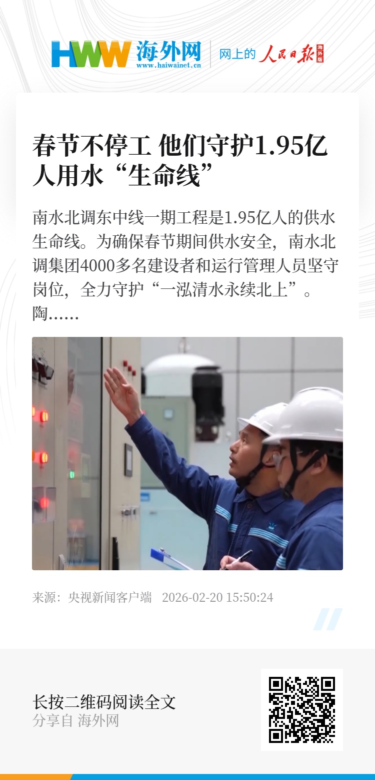 南水北调东中线一期工程是1.95亿人的供水生命线。为确保春节期间供水安全,南水北调集团4000多名建设者和运行管理人员坚守岗位,全力守护“一泓清水永续北上”。