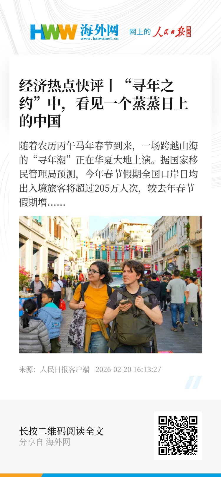 从去年共赴非遗春节,到今年入境游热潮升级,春节已超越国界,成为连接中国与世界的情感与文化桥梁。中国以烟火气与文化味兼具的文旅盛宴,迎接八方来客;世界在品味中国年味中,读懂一个生机盎然、蒸蒸日上的中国。这场跨越山海的“寻年之约”,既为中国经济注入能量,也将续写中外文明交流互鉴的篇章。