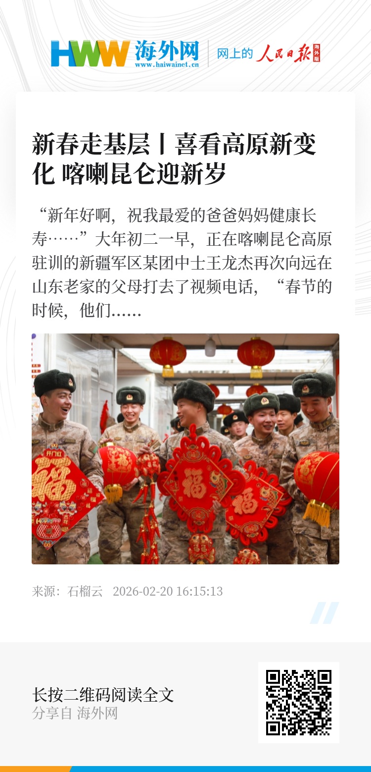“新年好啊,祝我最爱的爸爸妈妈健康长寿……”大年初二一早,正在喀喇昆仑高原驻训的新疆军区某团中士王龙杰再次向远在山东老家的父母打去了视频电话,“春节的时候,他们最想我,我也更想他们。”