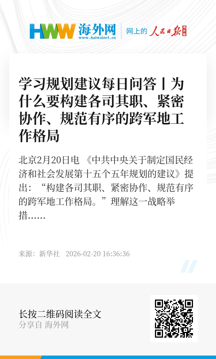 新华社北京2月20日电 《中共中央关于制定国民经济和社会发展第十五个五年规划的建议》提出:“构建各司其职、紧密协作、规范有序的跨军地工作格局。”理解这一战略举措的重大意义和实践要求,需要把握以下4个方面。
