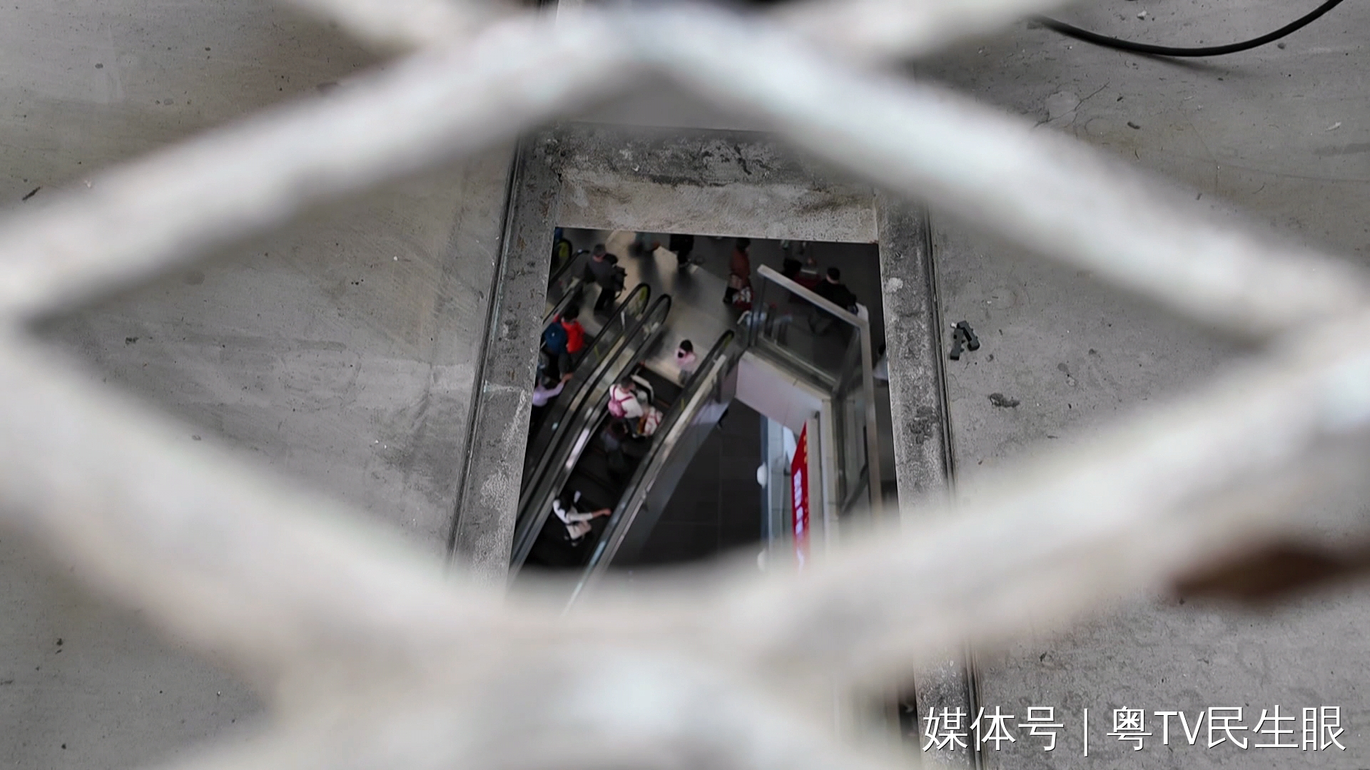 这是从铁丝网孔洞中往下看的视角,往下数两层楼,是广州南站正在运转的进站扶梯。